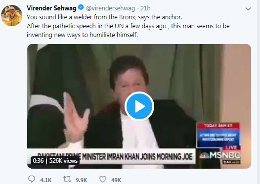 वीरेंद्र सहवाग ने गुरुवार को ट्विटर पर एक वीडियो साझा किया, जिसमें अमेरिकी न्यूज एंकर को इमरान के UNGA भाषण की आलोचना करते हुए देखा जा सकता है। इसे साझा करते हुए उन्होंने ट्वीट किया, ‘आप ब्रोंक्स के एक वेल्डर की तरह आवाज करते हैं, लंगर कहते हैं। कुछ दिनों पहले यूएन में अपने दयनीय भाषण के बाद, यह आदमी खुद को अपमानित करने के लिए नए तरीके खोज रहा है।’