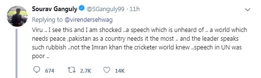 गांगुली ने वीरेंद्र सहवाग के एक ट्वीट के जवाब में लिखा- ‘वीरू, मैं यह देख रहा हूं और मैं स्तब्ध हूं…एक भाषण जो अनसुना है…एक ऐसी दुनिया जिसे शांति चाहिए, एक देश के रूप में पाकिस्तान को इसकी सबसे ज्यादा जरूरत है…और उनका नेता इस तरह की बकवास बोलता है … नहीं इमरान खान क्रिकेटर दुनिया को पता था … संयुक्त राष्ट्र में भाषण खराब था।’